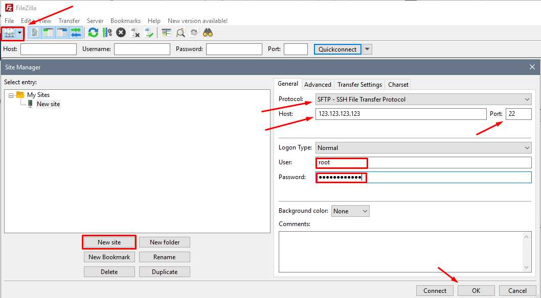 Откройте Site Manager (обычно Ctrl+S) → New site и заполните: